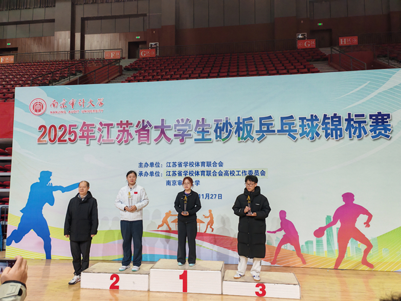 由江苏省学生体育协会主办的2025年江苏省大学生砂板乒乓球锦标赛,于11月27日-30日在南京审计大学举行。本次比赛设本科院校高水平组、本科院校普通组、高职高专院校组组别,共有来自全省33所高校299名运动员参赛,经过四天激烈鏖战,我校乒乓球队一路过关斩将,取得2金1银1铜的优异成绩,为学校赢得了荣誉。